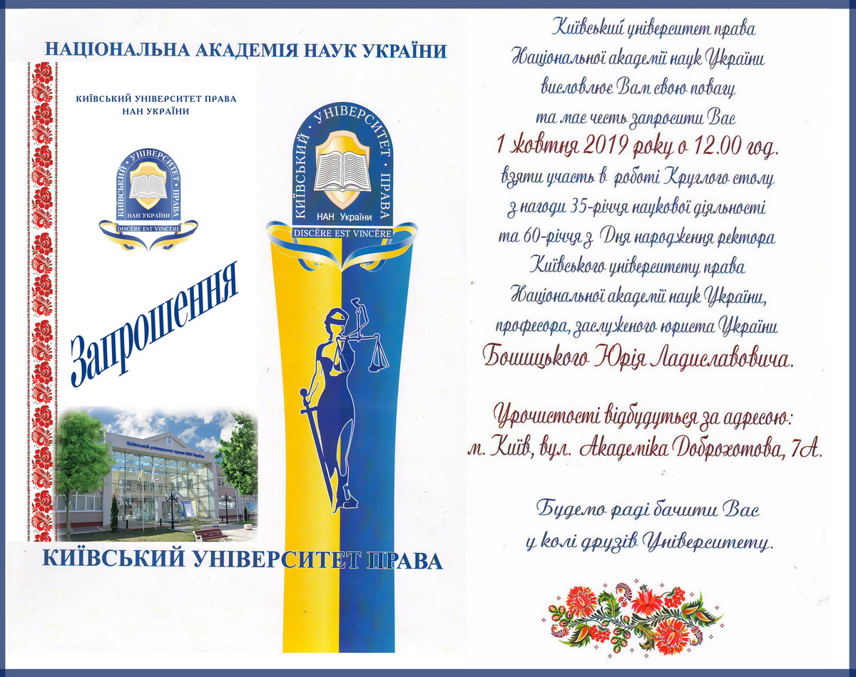 Свій ювілей святкує сьогодні ректор Київського університету права Юрій Ладиславович Бошицький. Його цілеспрямована, самовіддана праця, наполегливість, виваженість і мудрість, державне мислення, висока особиста культура й увага до кожного члена колективу, глибока повага до традицій і прагнення сміливо відповідати на виклики часу стали запорукою досягнень унікального закладу вищої юридичної освіти України — Київського університету права НАН України. Власним прикладом ректор КУП НАНУ надихає студентську молодь на визначення амбітних цілей і наполегливість у їх досягненні. Ю.Л.Бошицький є взірцем для зростаючих поколінь юристів України, ключовою фігурою освітнього та наукового життя не лише нашої держави, але й далеко за її межами.