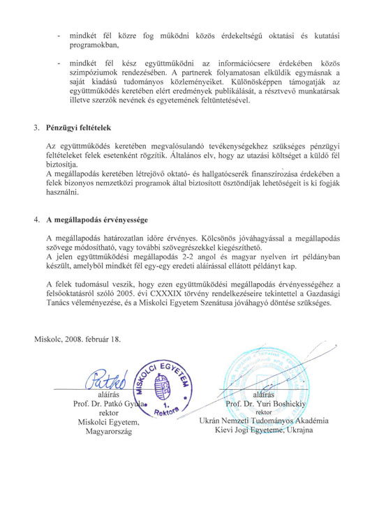 Навчання нової генерації юристів має базуватись на принципах європейського права, демократизації суспільства, захисту прав та інтересів пересічного громадянина. Для вивчення угорського досвіду у сфері юриспруденції, особливої цінності набуває розвиток та поглиблення наукових зв’язків з угорськими юридичними факультетами. Саме за для налагодження якісної взаємодії у науковому та освітньому напрямах між Київським університетом права і юридичним факультетом Мішкольцського університету сторонами було підписано угоду про довготривалу співпрацю..