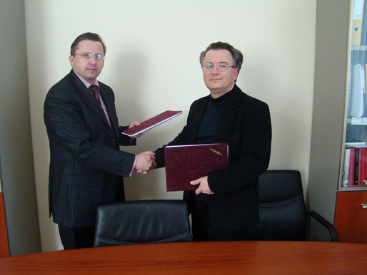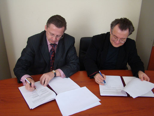 Ректор КУП НАН України, професор Ю. Бошицький, декан факультету права і політичних наук Дебреценського університету, професор Сабо Бела. Підписання угоди про співпрацю.