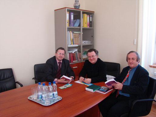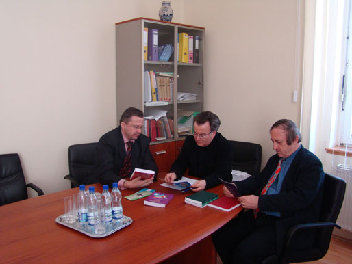 Ректор КУП НАН України, професор Ю. Бошицький, декан факультету права і політичних наук Дебреценського університету, професор Сабо Бела, професор Дерді Чечі. Обмін науковою літературою.