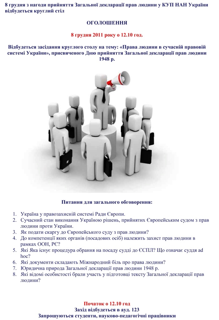 8 грудня з нагоди прийняття Загальної декларації прав людини у КУП НАН України відбудеться круглий стіл