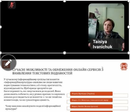 – Таїсія Іванійчук, кандидат біологічних наук, директор наукової бібліотеки Національного університету «Одеська юридична академія», яка висвітлила питання технічного контролю за дотриманням академічної доброчесності в академічних текстах;