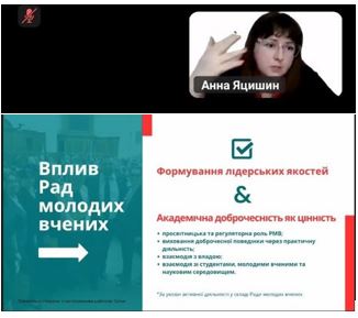 – Анна Яцишин, доктор педагогічних наук, старший науковий співробітник, провідний науковий співробітник та голова Ради молодих вчених Інституту цифровізації освіти НАПН України, з доповіддю про роль молодіжних наукових спільнот у формуванні доброчесного академічного середовища;