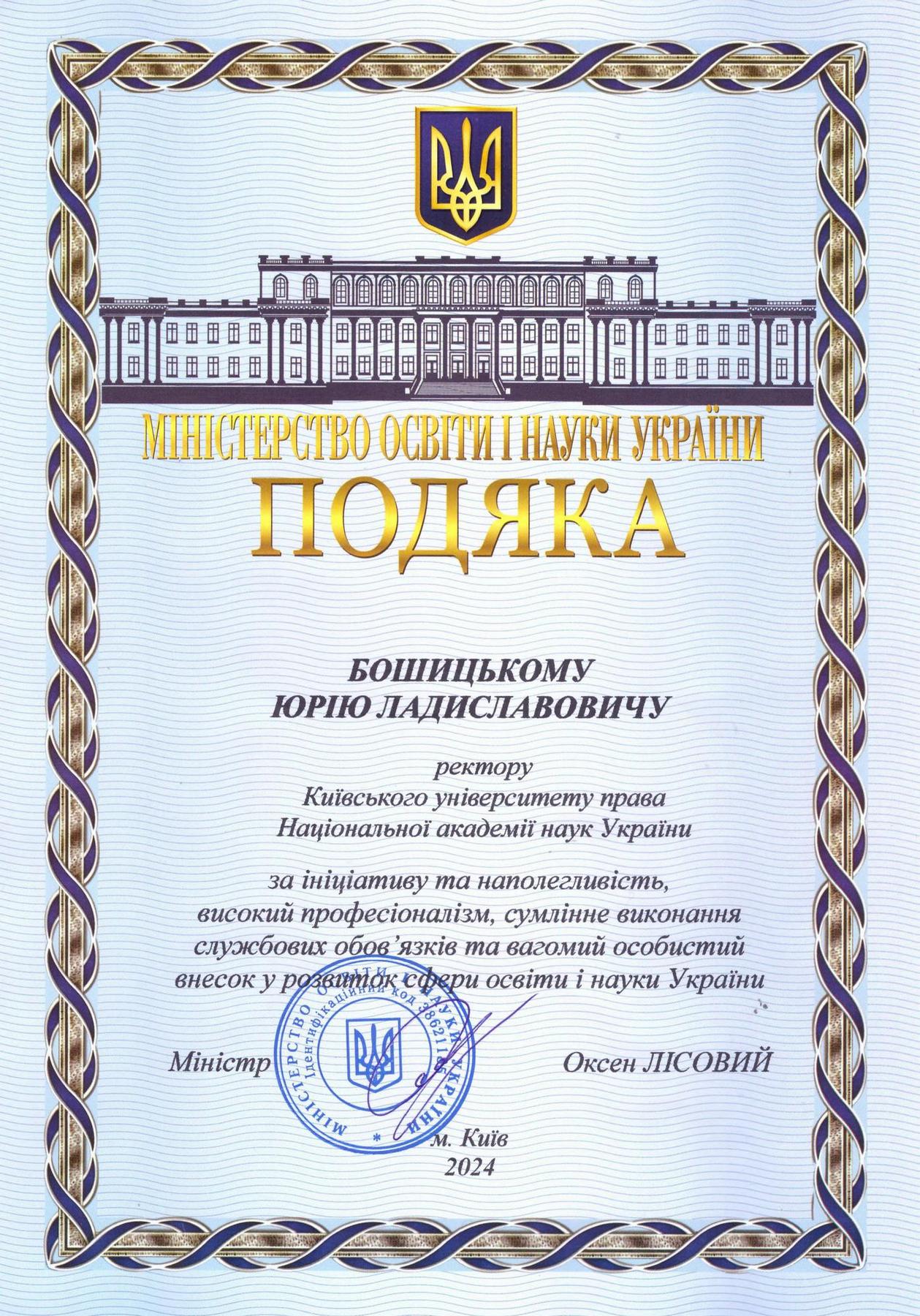 Перед початком обговорення питань порядку денного засідання ректорату з вітальним словом до присутніх звернулася радник ректора, д.ю.н., проф. Ірина Сопілко, оголосивши інформацію про те, що за сумлінну багаторічну працю, вагомий особистий внесок у підготовку висококваліфікованих фахівців-правників Міністерство освіти і науки України нагородило Подякою Міністерства освіти і науки України Бошицького Юрія Ладиславовича ‒ ректора Київського університету права НАН України, професора, заслуженого юриста України. Відповідні документи були передані Іриною Сопілко Юрію Бошицькому під аплодисменти присутніх членів ректорату КУП НАН України.