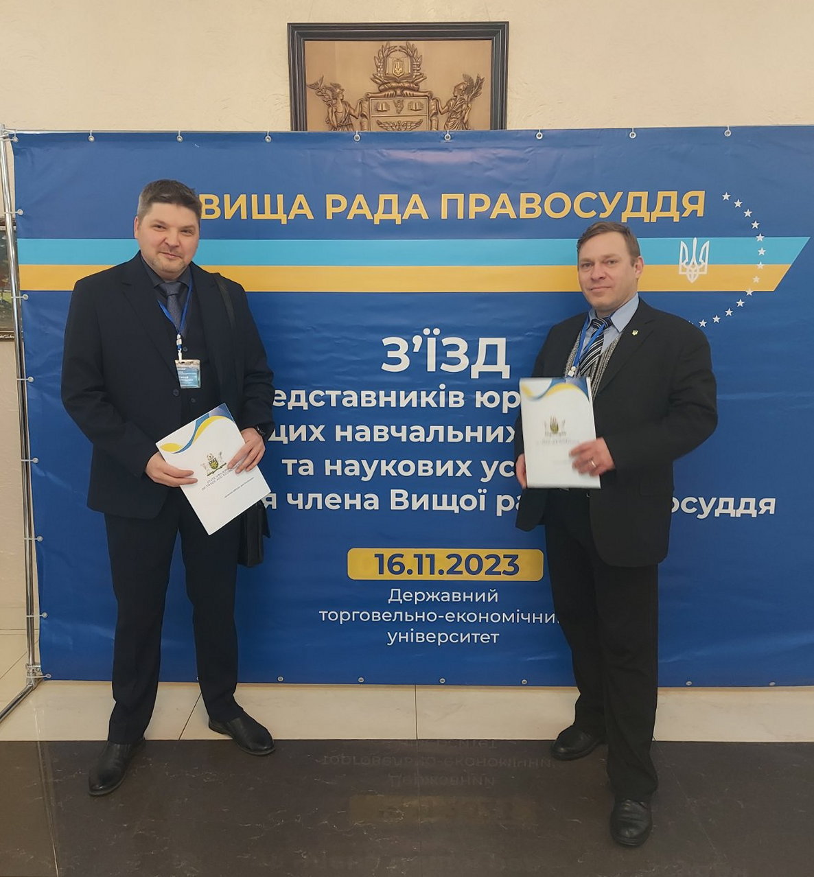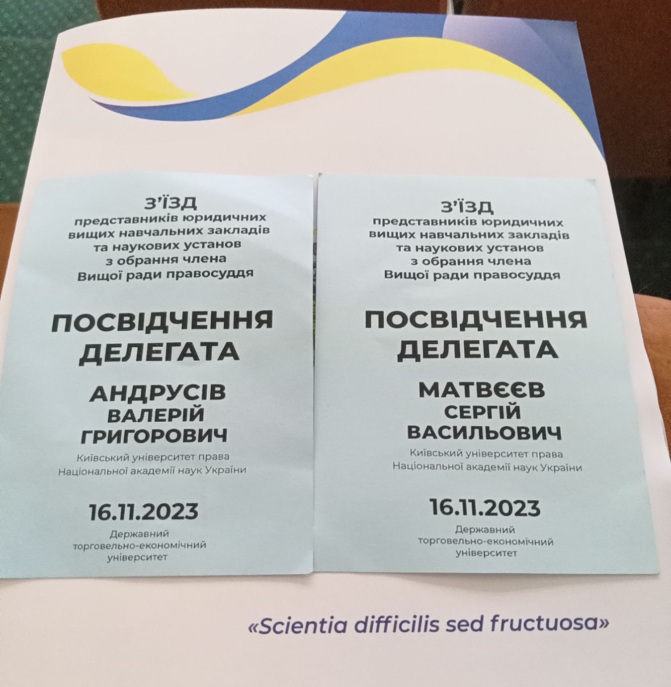 16 листопада 2023 року делегати від Київського університету права НАН України, завідувач кафедри загальнотеоретичних правових і соціально-гуманітарних дисциплін, кандидат юридичних наук, доцент Сергій Матвєєв та завідувач кафедри кримінального права та кримінального процесу, кандидат юридичних наук Валерій Андрусів, прийняли участь у З’їзді представників юридичних вищих навчальних закладів та наукових установ з обрання члена Вищої ради правосуддя.