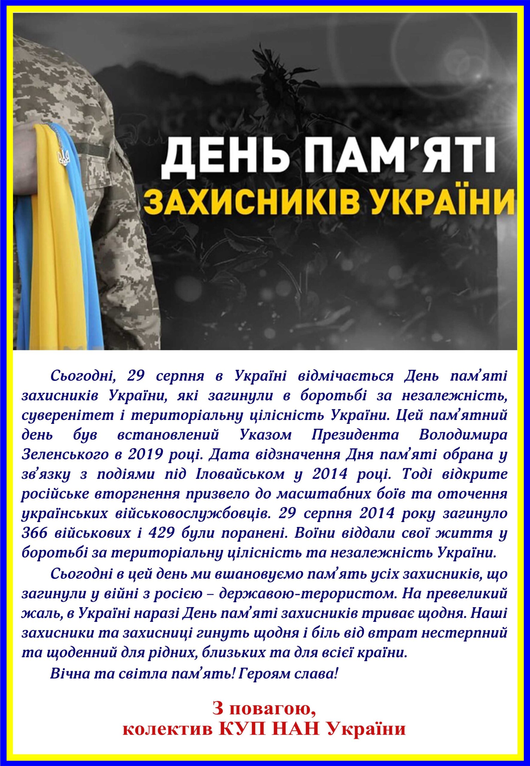 Сьогодні, 29 серпня в Україні відмічається День пам’яті захисників України, які загинули в боротьбі за незалежність, суверенітет і територіальну цілісність України. Цей пам’ятний день був встановлений Указом Президента Володимира Зеленського в 2019 році. Дата відзначення Дня пам’яті обрана у зв’язку з подіями під Іловайськом у 2014 році. Тоді відкрите російське вторгнення призвело до масштабних боїв та оточення українських військовослужбовців. 29 серпня 2014 року загинуло 366 військових і 429 були поранені. Воїни віддали свої життя у боротьбі за територіальну цілісність та незалежність України. Сьогодні в цей день ми вшановуємо пам’ять усіх захисників, що загинули у війні з росією ‒ державою-терористом. На превеликий жаль, в Україні наразі День пам’яті захисників триває щодня. Наші захисники та захисниці гинуть щодня і біль від втрат нестерпний та щоденний для рідних, близьких та для всієї країни. Вічна та світла пам’ять! Героям слава!