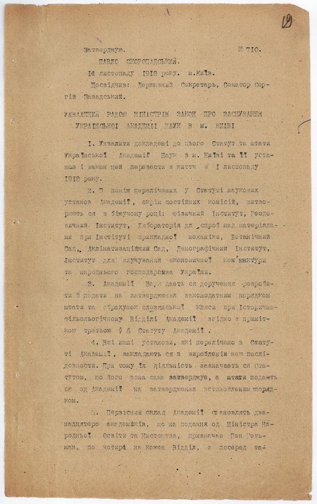 Хронологія історичних подій була наступна: 14 листопада 1918 року гетьманом України Павлом Скоропадським було затверджено Закон «Про заснування Української академії наук в м. Києві».