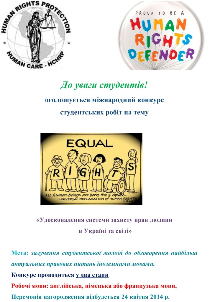 До уваги студентів! оголошується міжнародний конкурс студентських робіт на тему «Удосконалення системи захисту прав людини в Україні та світі»