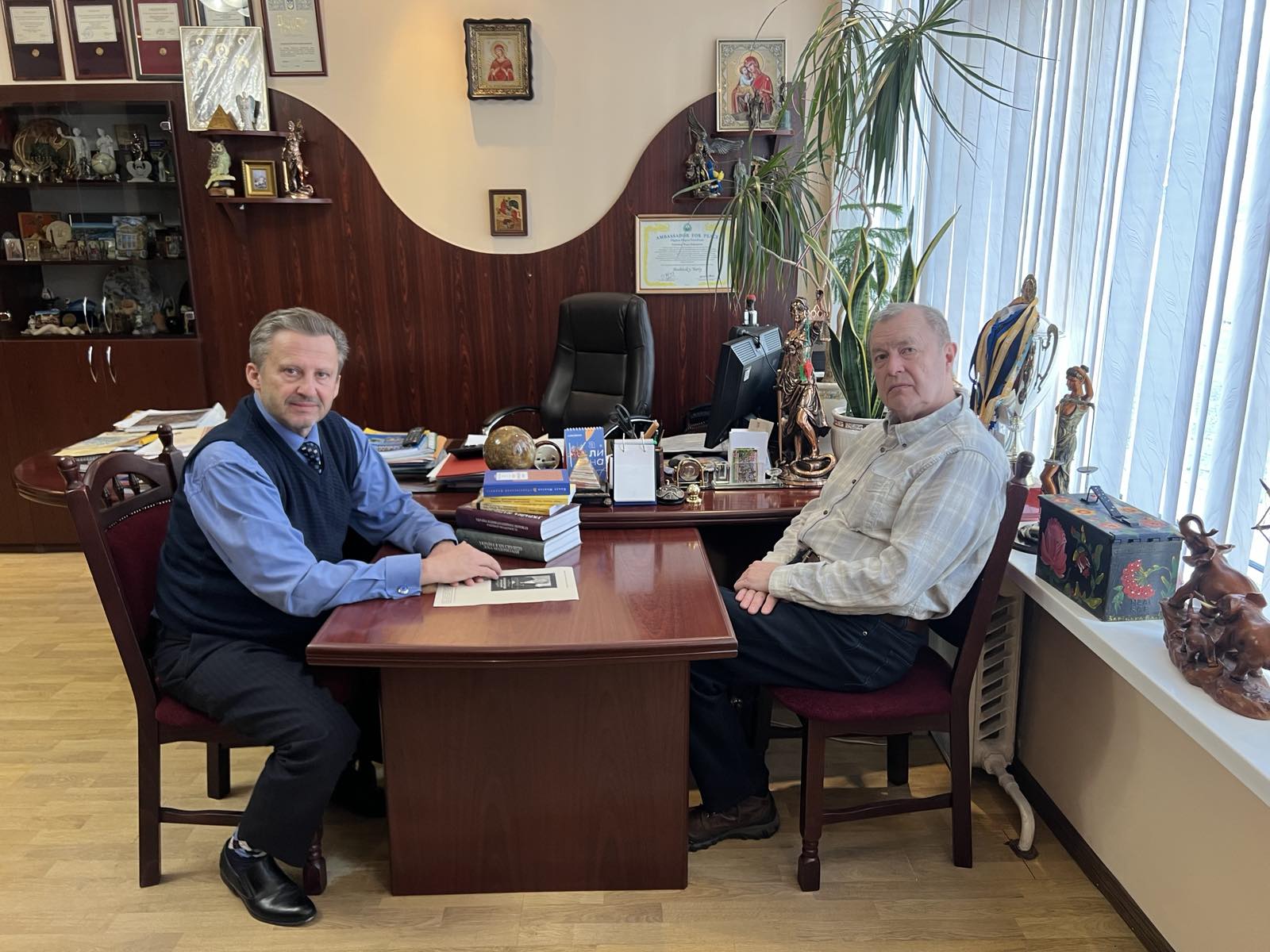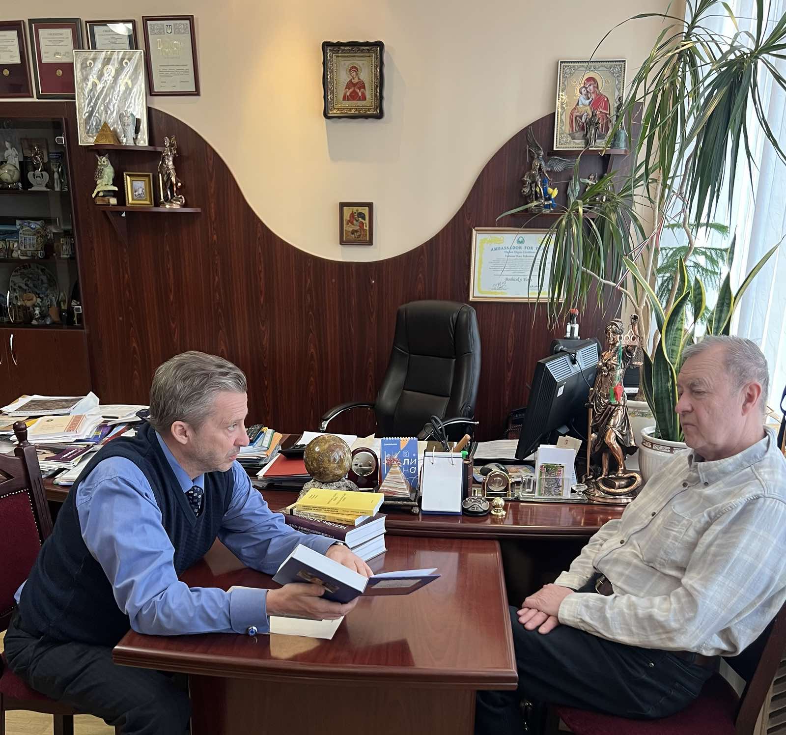 Предметом спілкування з ректором стали питання в науковій, навчальній та профорієнтаційній діяльності. Професор Зайчук подарував для бібліотеки колекцію книг юридичного спрямування, своїх та Зайчука Юрія Володимировича.