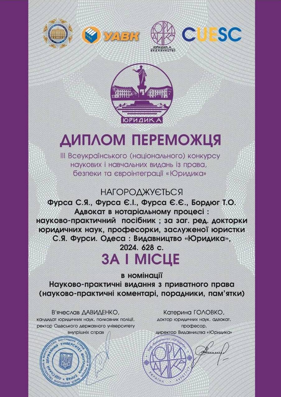 Хочемо поділитися із Вами важливою подією у житті вчених університету та радістю. Науково-практичний посібник, підготовлений авторським колективом − д.ю.н, професором, заслуженим юристом України С.Я. Фурсою, к.ю.н., професором Є.І. Фурсою, к.ю.н. Є.Є. Фурсою, доктором філософії у галузі права Т.О. Бордюг “Адвокат в нотаріальному процесі” (Одеса: Видавництво “Юридика”, 2024. 628с.) 16.05.2025 р. до Дня науки був удостоєний відзнакою – Дипломом переможця III Всеукраїнського (національного) конкурсу наукових і навчальних видань із права, безпеки та євроінтеграції “Юридика” за I місце в номінації Науково-практичні видання з приватного права (науково-практичні коментарі, порадники, памятки).