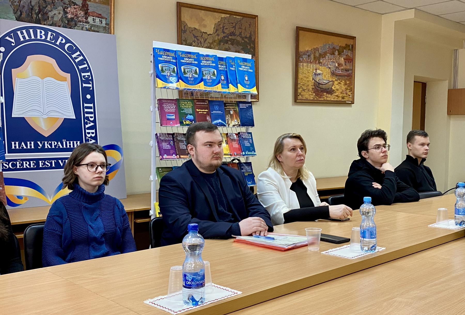 Модераторами заходу від КУП НАНУ виступили старший викладач кафедри загальнотеоретичних правових та соціально-гуманітарних дисциплін Володимир Павлов та доцент кафедри кримінального права та процесу Наталія Веселовська.