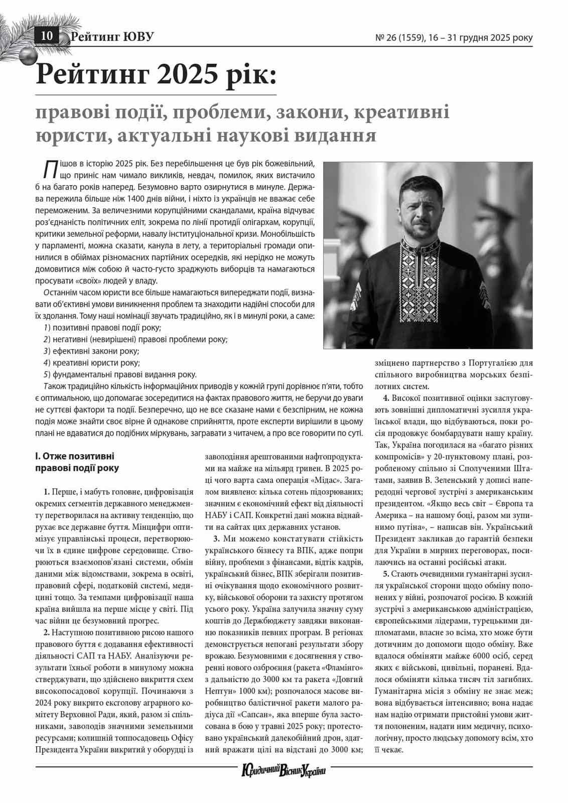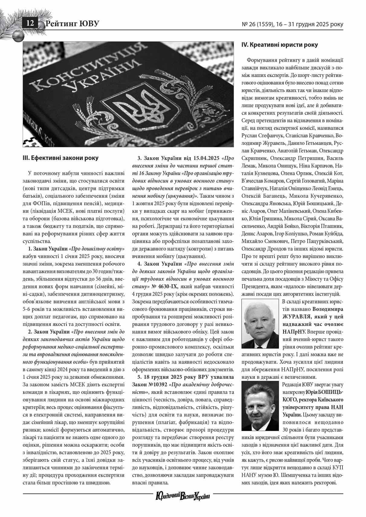 Рейтинг «Юридичного вісника України» за 2025 рік, присвячений ключовим правовим подіям, проблемам, законам та видатним креативним юристам, підтвердив очевидне: Юрій Бошицький — один із тих, хто формує сучасну історію українського права, послідовно працюючи на його зміцнення, модернізацію та підвищення престижу юридичної професії.