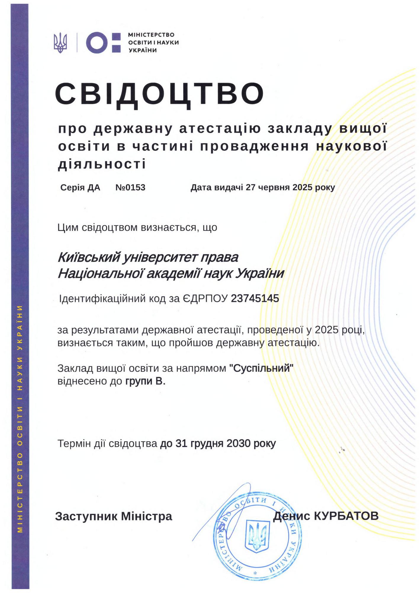 Свідоцтво про державну атестацію наукової діяльності від 27.06.2025 р.