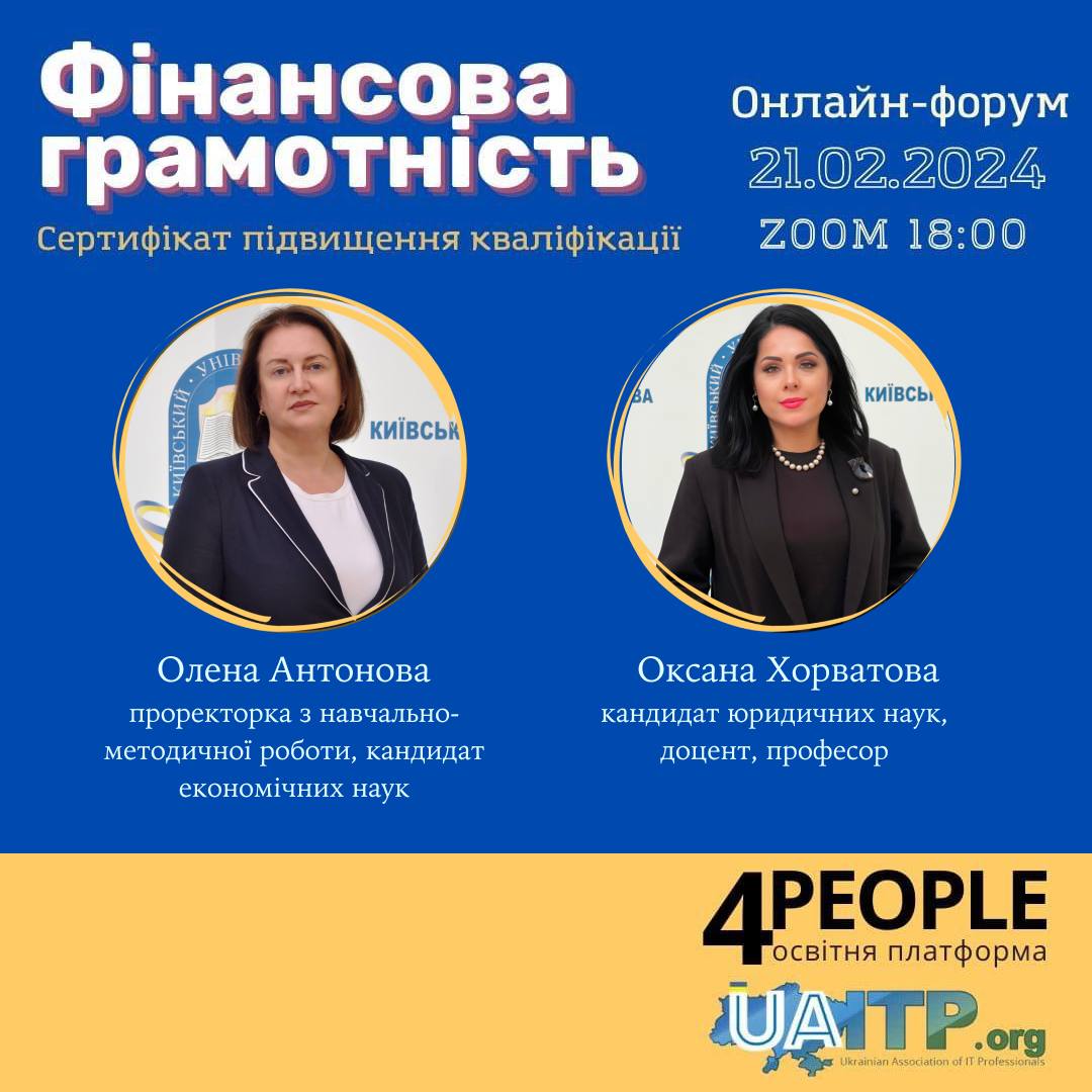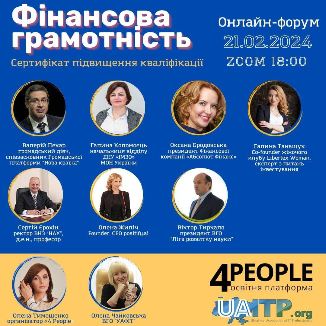 Минулого тижня в Києві відбувся форум «Фінансова грамотність», який був організований та проведений освітньою платформою «4PEOPLE» з метою обговорення найефективніших практик з підвищення фінансової інклюзії населення, оцінки досвіду викладання фінансової грамотності у закладах освіти, зосередження уваги на формуванні підприємницьких навичок у студентів, підвищення рівня фінансової грамотності освітян. У форумі приймали участь фахівці в галузі вищої освіти та підвищення якості у загальноосвітніх навчальних закладах, представники бізнесу, експерти ринку криптовалют, технології блокчейн та з питань інвестування на фінансових ринках. Загальна кількість учасників становила майже 200 осіб, що свідчить про актуальність та необхідність проведення таких заходів.