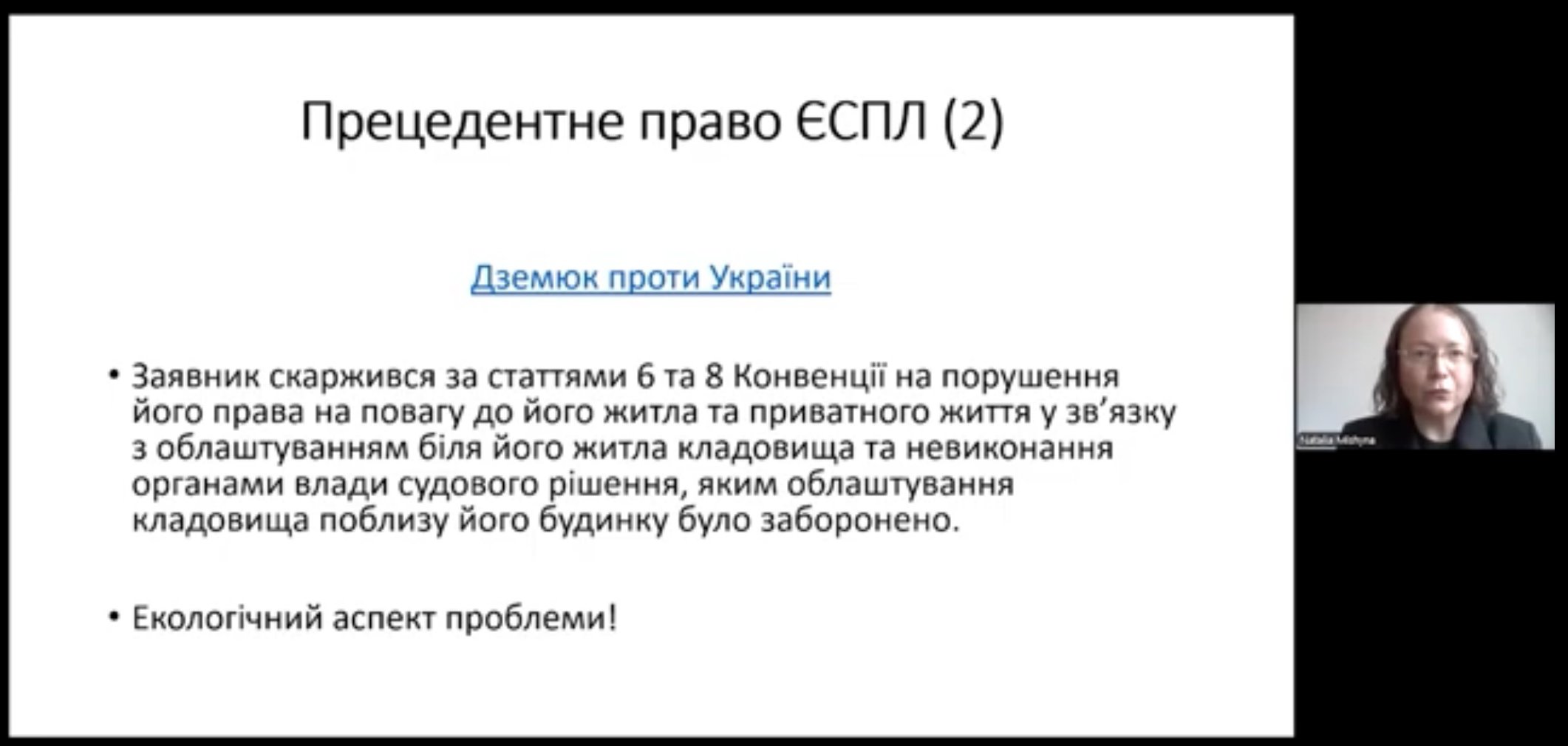 У ході лекції професорка детально розглянула принцип субсидіарності, окреслила основні проблеми, пов’язані з кризою виконання рішень ЄСПЛ, а також проаналізувала ключові аспекти прецедентної практики Суду. Значна увага була приділена практичним кейсам та найкращим підходам, застосовуваним у різних європейських країнах.