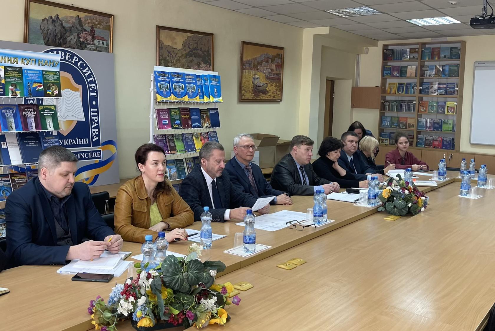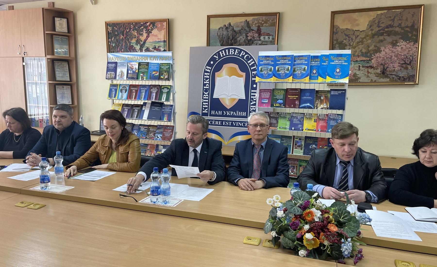З доповіддю про нові перспективні напрямки співпраці та взаємодії з Київським університетом права НАН України виступив представник давнього партнеру університету в науковій та освітній діяльності ‒ директор Інституту економіко-правових досліджень імені В. К. Мамутова НАН України, член-кореспондент НАН України, д.ю.н. Володимир Устименко. Виступ почесного гостя та партнера КУП НАН України отримав схвальну підтримку серед членів ректорату КУП НАН України. Одноголосно було ухвалене рішення про необхідність оновлення меморандуму про співпрацю між КУП НАН України та Інститутом економіко-правових досліджень імені В. К. Мамутова НАН України в освітній та науковій сферах.