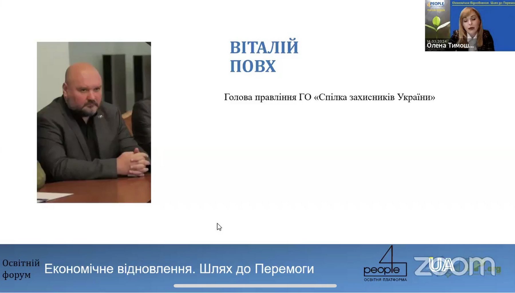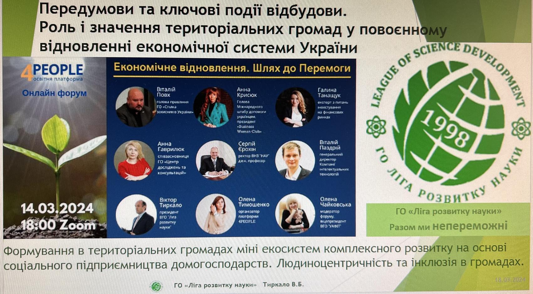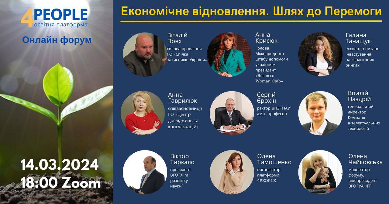 З важливими питаннями щодо економічного розвитку воєнної України та майбутньої відбудови Віталій Повх, голова правління ГО «Спілка захисників України»; Ганна Крисюк, голова Міжнародного штабу допомоги українцям, президент «Business Woman Club», ініціатор та організатор глобального екологічного проєкту «Greening of the Planet», співзасновниця ГО «Промінь Україна»; Сергій Єрохін, ректор Національної академії управління, доктор економічних наук, професор, український вчений, фахівець в галузі економічної теорії, макроекономіки, державного регулювання, почесний доктор Брюссельського Вільного університету підприємницьких наук і технологій, екс-радник Прем’єр-міністра України; Віктор Тиркало, президент ВГО «Ліга розвитку науки», член Правління Громадської спілки «Київський Форум волонтерів», директор програм МВА, консультант з розвитку малого та середнього бізнесу, співзасновник та, директор Київської Бізнес Школи; Віталій Паздрій, кандидат економічних наук (PhD), доцент кафедри бізнес-економіки та підприємництва Київського національного економічного університету імені В. Гетьмана, генеральний директор Компанії інтелектуальних технологій; Анна Гаврилюк, кандидат економічних наук, співзасновниця ГО «Центр досліджень та консультацій», MEAL Officer, Data Base Analist; Галина Танащук, експерт із питань інвестування на фінансових ринках, 14 років практичного досвіду у великих міжнародних компаніях-лідерах ринку, психолог, ведуча фінансових ігор Cash Flow, бізнес-девелопер освітнього проекту «Life Academy», Буенос Айрес, Аргентина. Модератором заходу стали: Олена Чайковська – декан факультету дистанційного навчання КНУКіМ, віцепрезидентц ВГО «УАФІТ» та Олена Тимошенко, організатор освітньої платформи «4 PEOPLE» д.е.н., професор.