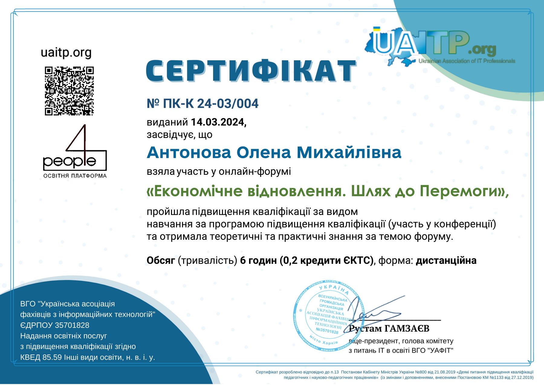 Від Київського університету права Національної академії наук України участь у заході прийняли проректор з навчально-методичної роботи к.е.н. Олена Антонова та к.ю.н., доцент, доцент кафедри міжнародного права та галузевих правових дисциплін Оксана Хорватова. Учасники заходу отримали Сертифікати про підвищення кваліфікації, які зареєстровано в Переліку виданих документів про підвищення кваліфікації ВГО «Українська асоціація фахівців інформаційних технологій» та складено відповідно до п.13 Постанови Кабінету Міністрів України №800 від 21.08.2019 «Деякі питання підвищення кваліфікації педагогічних і науково-педагогічних працівників» (із змінами і доповненнями, внесеними Постановою КМ №1133 від 27.12.2019).