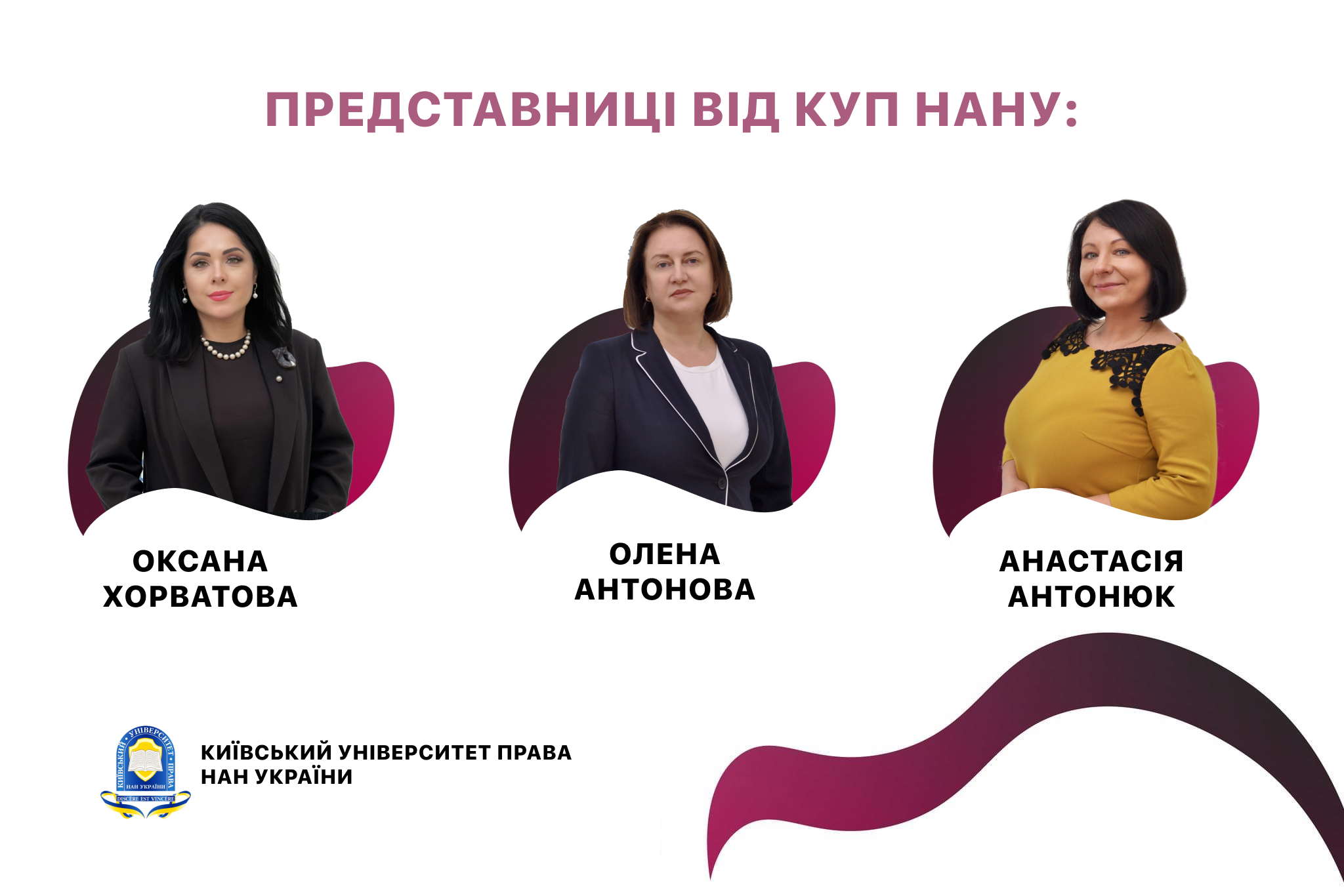 Від Київського університету права Національної академії наук України в заході прийняли участь: проректор з навчально-методичної роботи, к.е.н. Олена Антонова; завідувач кафедри міжнародного права та галузевих правових дисциплін, к.ю.н., доцент Анастасія Антонюк та доцент кафедри міжнародного права та галузевих правових дисциплін, к.ю.н., доцент Оксана Хорватова, яка є членкінею Асоціацією жінок-юристок України «ЮрФем».