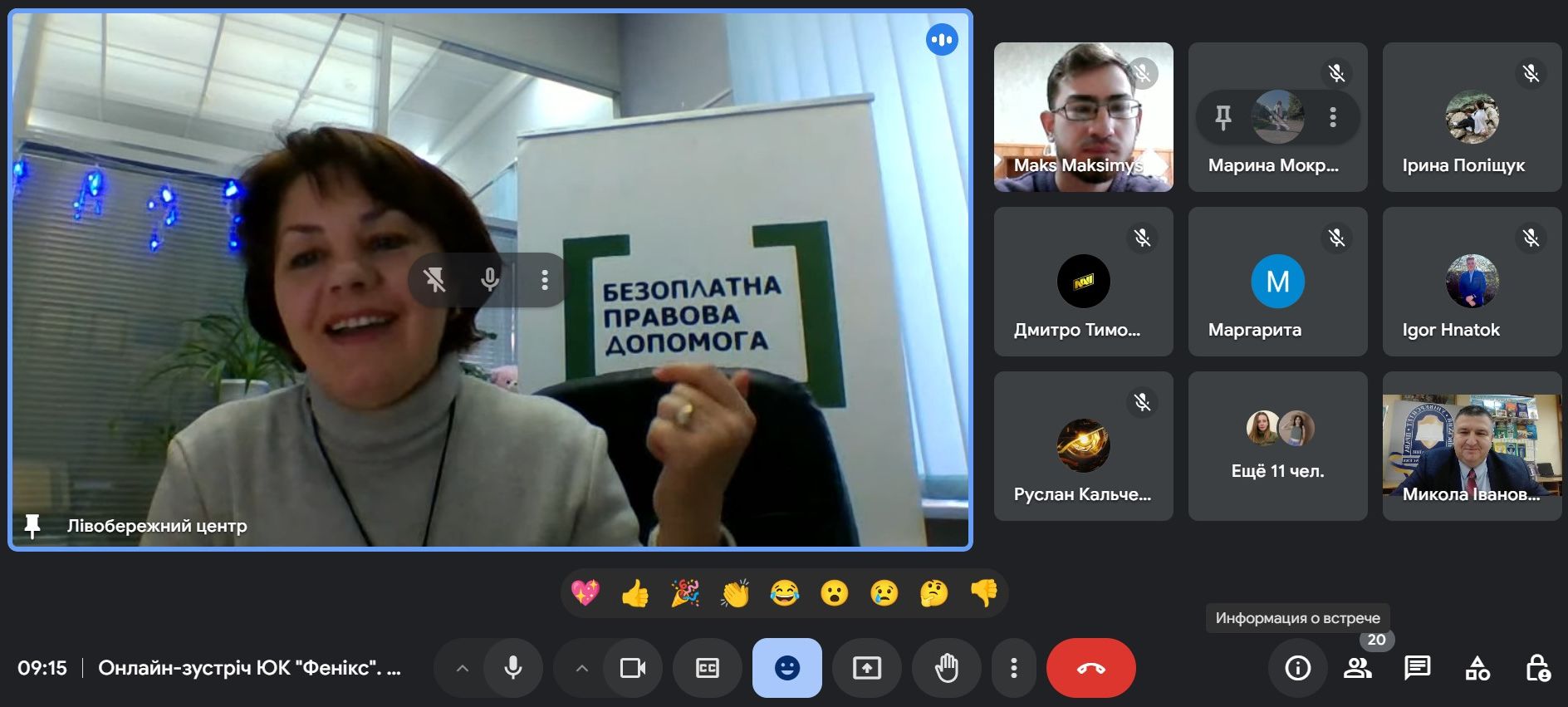 Проведено онлайн-зустріч представників юридичної клініки «Фенікс» КУП НАНУ з начальником Київського відділу надання безоплатної правничої допомоги Придніпровського управління безоплатної правничої допомоги Північного міжрегіонального центру з надання безоплатної правничої допомоги Лілією ЙОЛКІНОЮ