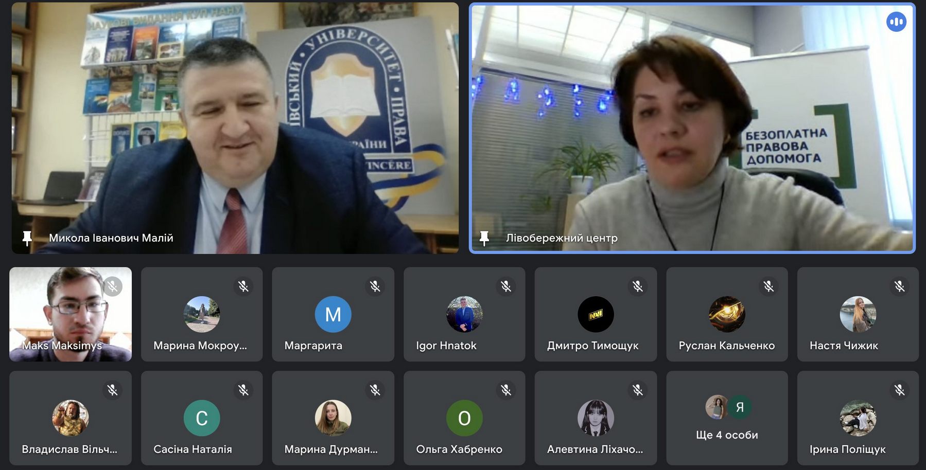 18 грудня 2024 року відбулася онлайн-зустріч здобувачів, які проходять фахову практику в юридичній клініці «Фенікс» Київського університету права НАН України з начальником Київського відділу надання безоплатної правничої допомоги Придніпровського управління безоплатної правничої допомоги Північного міжрегіонального центру з надання безоплатної правничої допомоги Лілією ЙОЛКІНОЮ.