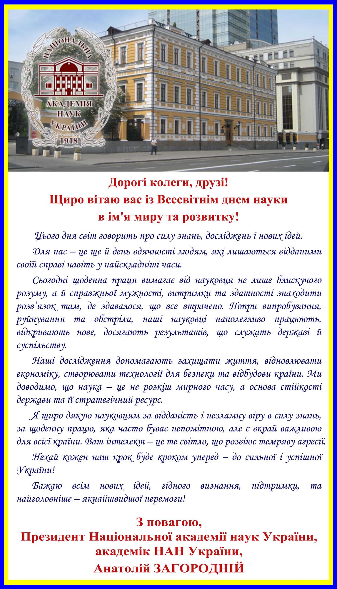 Привітання Президента Національної академії наук України академіка Анатолія Загороднього з нагоди Всесвітнього дня науки в ім’я миру та розвитку