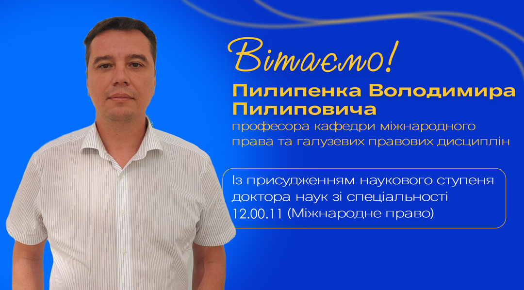 Київський університет права Національної академії наук України щиро вітає професора кафедри міжнародного права та галузевих правових дисциплін Пилипенка Володимира Пилиповича із присудженням наукового ступеня доктора наук спеціальністю 12.00.11 – «Міжнародне право».