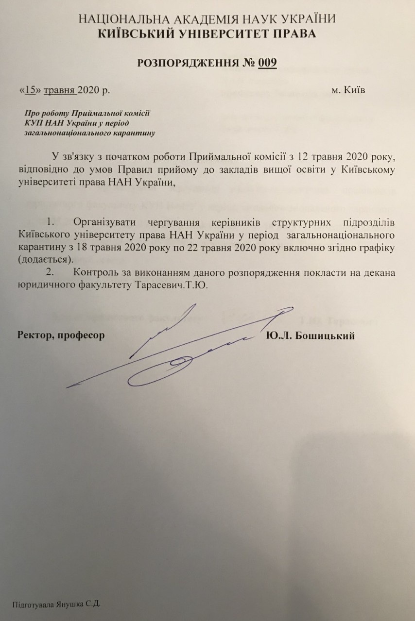 Розпорядження ректора КУП НАНУ щодо роботи приймальної комісії під час карантину
