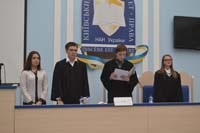 Роль суддів виконували: Невінчаний Микола, студент 3-го курсу ПБ, Буфан Василь, студент 2-го курсу ПБ, заступник президента Студентського парламенту КУП НАНУ та Теплова Катерина, студентка 5-го курсу магістратури. У ролі судового розпорядника був Поперечний Дмитро, студент 1-го курсу МП, голова комітету культури та дозвілля Студентського парламенту КУП НАНУ.