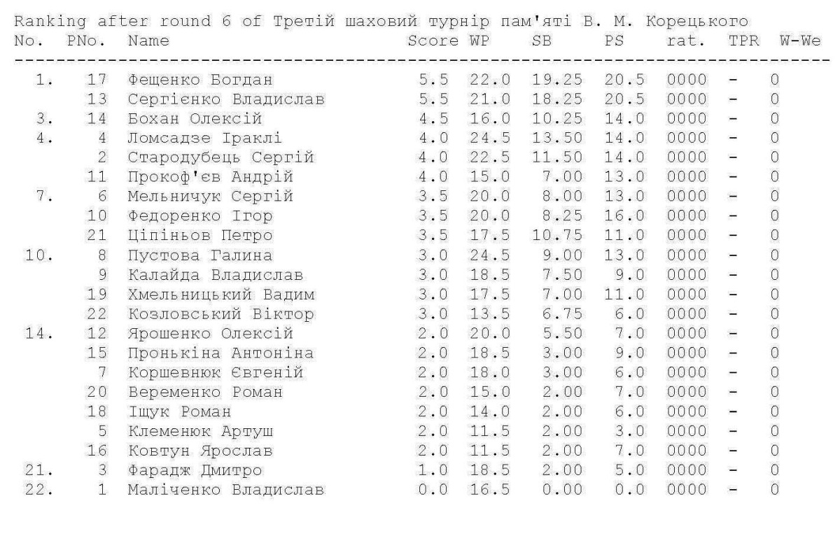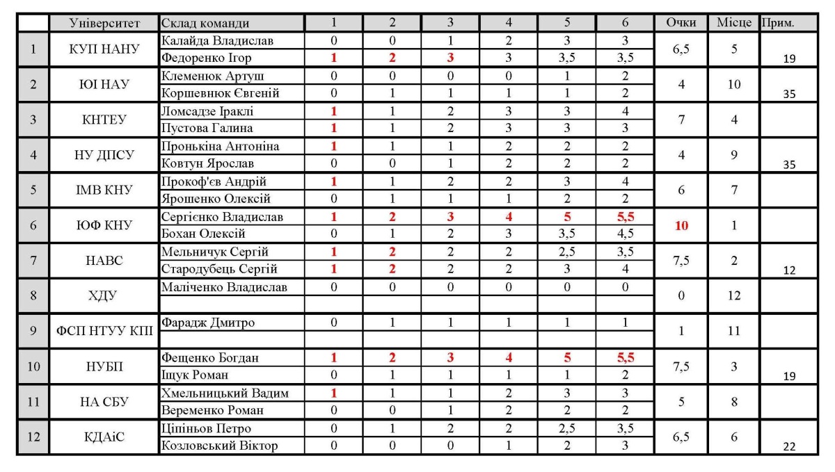 Напружена боротьба тривала до останнього туру. Лідери після останнього туру Владислав Сергієнко (ЮФ КНУ ім.. Шевченка) та Богдан Фещенко (НУБП), які не мали до цього втрат в очках, зустрілись в очному поєдинку в останньому турі. Гра не виявила переможця, тому обидва набрали однакову кількість очок – по 5,5 і тільки за додатковим коефіцієнтом, переможцем в турнірі став Богдан Фещенко (Національний університет біоресурсів і природокористування України). Відповідно, срібним призером став Владислав Сергієнко (Юридичний факультет Київського національного університету імені Тараса Шевченка), а третє місце посів інший представник цієї ж команди – Олексій Бохан (4,5 очки).