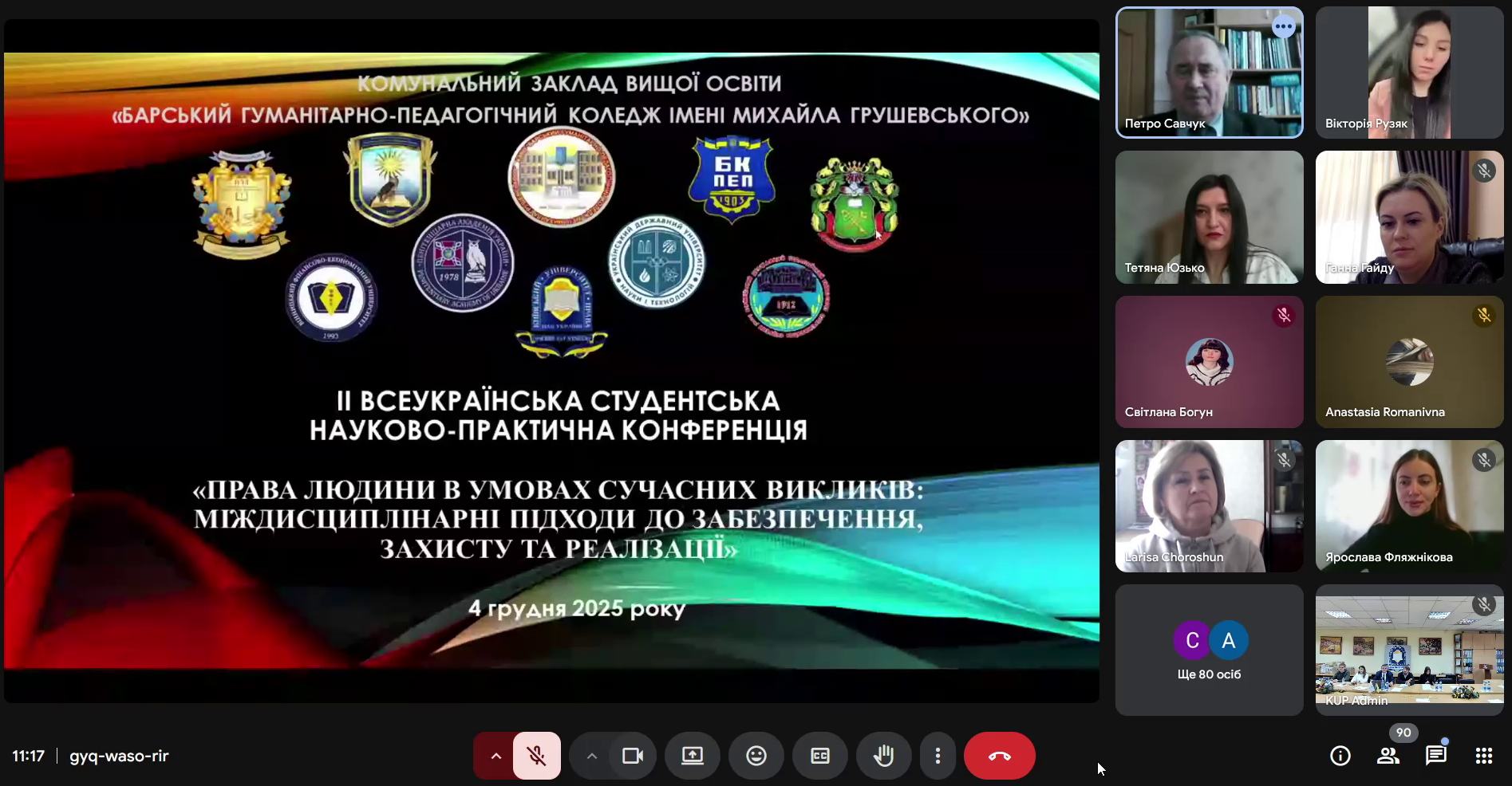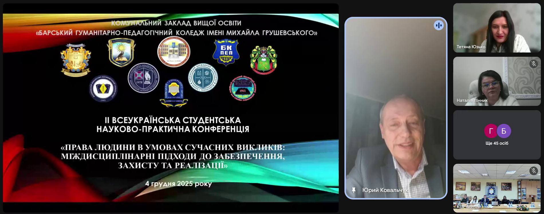 04 грудня 2025 відбулась ІІ Всеукраїнська науково-практична конференція «Права людини в умовах сучасних викликів: міждисциплінарні підходи до забезпечення, захисту та реалізації», в якій взяли участь студенти Київського університету права НАН України та його структурні підрозділи, а саме Рівненського інституту права КУП НАНУ та Вінницького науково-консультативного центру КУП НАНУ, комунального закладу вищої освіти «Барський гуманітарно-педагогічний коледж імені Михайла Грушевського», Вінницького державного педагогічного університету імені Михайла Коцюбинського, Бердичівського фахового коледжу промисловості, економіки та права, відокремленого структурного підрозділу «Кам’янець-Подільський фаховий коледж Закладу вищої освіти «Подільський державний університет», громадської організації «Всеукраїнська асоціація кримінального права», навчально-наукового інституту Українського державного хіміко-технологічного університету Українського державного університету науки і технологій, навчально-наукового інституту права та психології Національної академії внутрішніх справ, Пенітенціарної академії України, Хмельницького кооперативного торговельно-економічного інституту, Вінницького фінансово-економічного університету, закладу вищої освіти «Подільський державний університет».