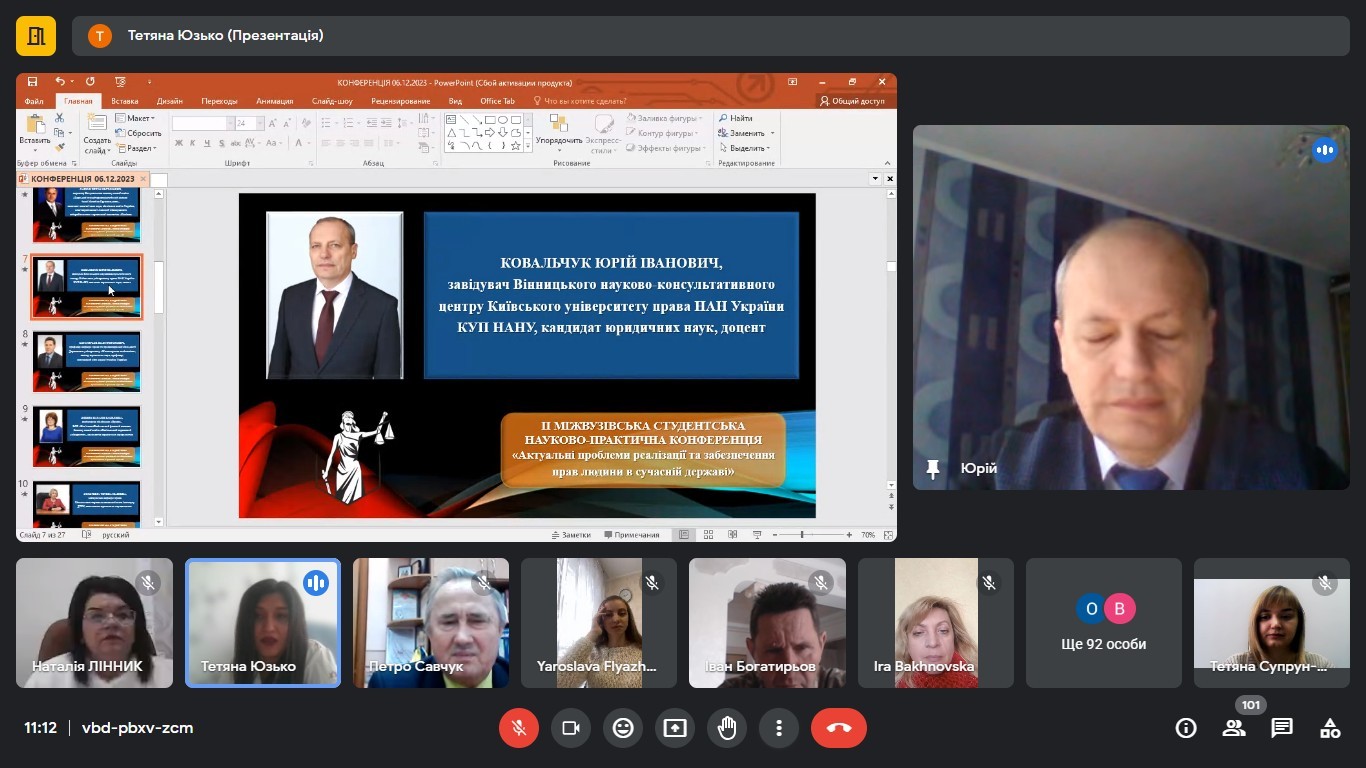 Київський університет права НАН України представляли керівник структурного підрозділу КУП НАНУ в м. Вінниці Ковальчук Юрій Іванович та завідувач кафедри міжнародного права та галузевих правових дисциплін Антонюк Анастасія Борисівна, які виступили і науковими керівниками здобувачів вищої освіти, що прийняли участь у заході від університету.