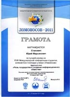 Доповідь Становича Юрія про політичні, соціально-правові і організаційно-технологічні аспекти забезпечення розвитку інформаційного суспільства на досвіді Польщі та Чехії була визнана кращою, за що йому вручили грамоту та книгу академіка Макарова В.Л. «Соціальний кластеризм. Російський виклик» (з особистим автографом автора).