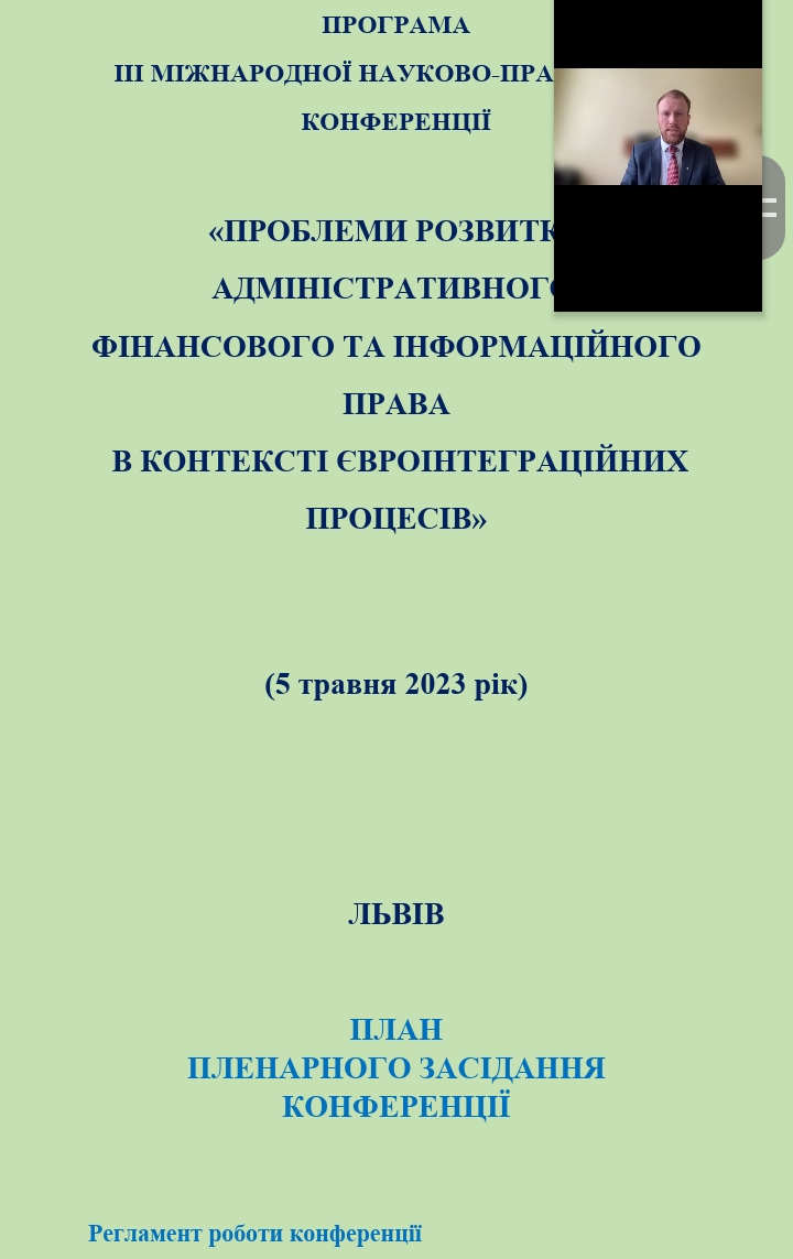05 травня 2023 року Національний університет «Львівська політехніка» проводив III Міжнародну науково-практичну конференцію на тему: «Проблеми розвитку адміністративного, фінансового та інформаційного права в контексті євроінтеграційних процесів». Незважаючи на непростий час, конференція пройшла досить душевно та тривала більше трьох годин, в ході яких з вітальним словом звернувся ОРТИНСЬКИЙ Володимир Львович, доктор юридичних наук, професор, Заслужений юрист України, директор Навчально-наукового інституту права, психології та інноваційної освіти Національного університету «Львівська політехніка»; з вступним словом виступила БЛІХАР Марія Миронівна, докторка юридичних наук, професорка, завідувачка кафедри адміністративного та інформаційного права Навчально-наукового інституту права, психології та інноваційної освіти Національного університету «Львівська політехніка»; питання допомоги тимчасово переміщеним особам розглянув ІВАНСЬКИЙ Андрій Йосипович, доктор юридичних наук, професор, Заслужений юрист України, адвокат, головний науковий співробітник Державної наукової установи «Інститут інформації, безпеки та права» Національної академії правових наук України, професор кафедри державно-правових дисциплін Міжнародного гуманітарного університету (Одеса); спірні питання забезпечення виконання податкового обов’язку розглядала МАЩЕНКО Ольга Вікторівна, перший проректор з науково-педагогічної та наукової роботи, докторка економічних наук, докторка юридичних наук, професорка Класичного приватного університету (Запоріжжя); діяльність незалежних регуляторів (агенств) розкрив САВЧИН Михайло Васильович, доктор юридичних наук, професор, професор кафедри адміністративного, фінансового та інформаційного права Ужгородського національного університету (Ужгород); питання оподаткування малого бізнесу аналізувала АНІСТРАТЕНКО Юлія Ігорівна, докторка юридичних наук, доцентка, заступник директора Навчально-наукового інституту права з наукової роботи Державного податкового університету (Ірпінь); питання впровадження цифрових інструментів піднімала ШОПІНА Ірина Миколаївна, докторка юридичних наук, професорка, професорка кафедри адміністративно-правових дисциплін Інституту права Львівського державного університету внутрішніх справ (Львів); правові аспекти роботи з криптоактивами розглядала РЯДІНСЬКА Валерія Олександрівна, докторка юридичних наук, професорка, завідувачка науково-дослідної лабораторії Державного науково-дослідного інституту з проблем правового та організаційного забезпечення діяльності Міністерства внутрішніх справ України (Київ); також цікавою і змістовною була доповідь ЛУК’ЯНОВОЇ Галини Юріївни, докторки юридичних наук, професорки, професорки кафедри адміністративного та інформаційного права Навчально-наукового інституту права, психології та інноваційної освіти Національного університету «Львівська політехніка» про правові гарантії доступу до інформації. Захід провела неперевершена БЛІХАР Марія Миронівна, докторка юридичних наук, професорка, завідувачка кафедри адміністративного та інформаційного права Навчально-наукового інституту права, психології та інноваційної освіти Національного університету «Львівська політехніка».