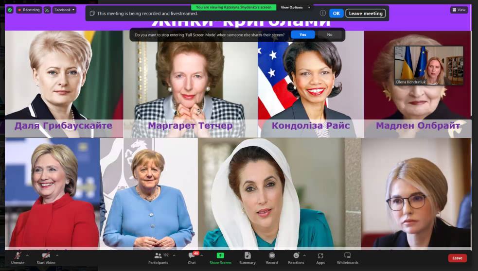 Дякуємо організаторам даної онлайн лекції-дискусії із заступницею Голови Верховної Ради України Оленою Кондратюк за чудову організацію, за можливість спілкування з жінками-лідерами та отримання практичного досвіду щодо даної тематики.
