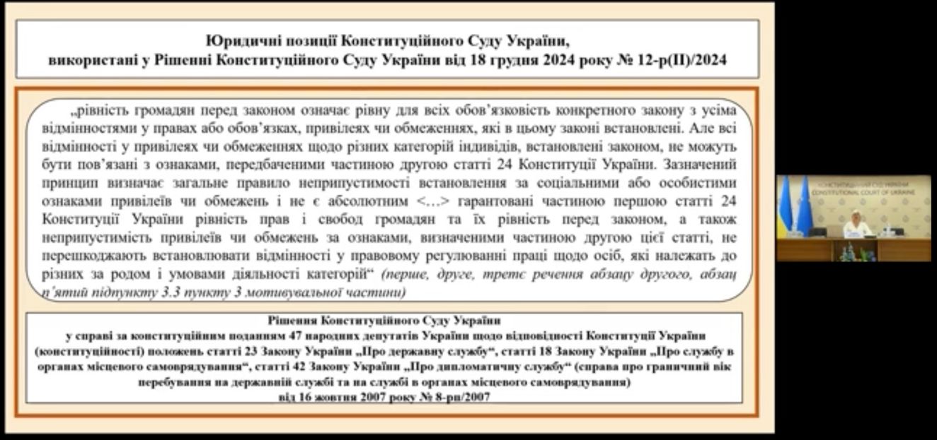 У ході лекції суддя акцентувала увагу на ключових положеннях Рішення № 12-р(ІІ)/2024 у справі щодо конституційних гарантій прав фізичних осіб-підприємців в Україні, розглянутій за конституційною скаргою Кирила Бурми. Вона зазначила, що заявник оспорював норму статті 51 Цивільного кодексу України, відповідно до якої «до підприємницької діяльності фізичних осіб застосовуються нормативно-правові акти, що регулюють підприємницьку діяльність юридичних осіб, якщо інше не встановлено законом або не випливає із суті відносин».
