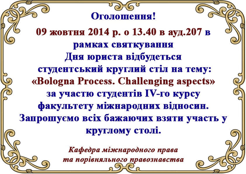 Увага! 09 жовтня 2014 р. відбудеться студентський круглий стіл на тему: «Bologna Process. Challenging aspects»