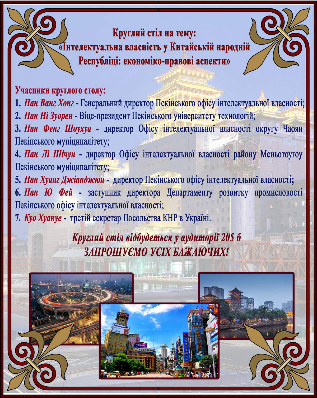 Увага! 11 квітня 2017 року в Київському університеті права НАН України відбудеться круглий стіл за участю представників делегації Китайської Народної Республіки