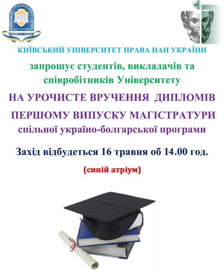 Увага! 16 травня відбудеться урочисте вручення дипломів першому випуску магістратури спільної україно-болгарської програми «Право європейського союзу та безпека»