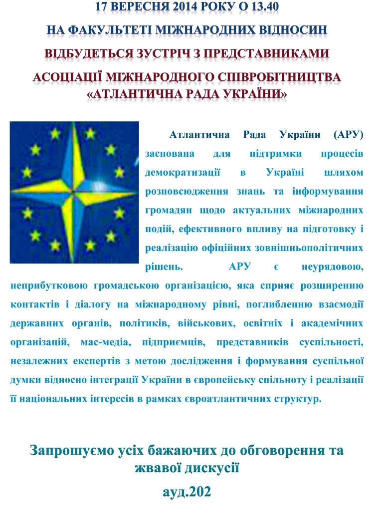 Увага! 17 вересня 2014 року на факультеті міжнародних відносин відбудеться зустріч з представниками Асоціації міжнародного співробітництва «Атлантична рада України»