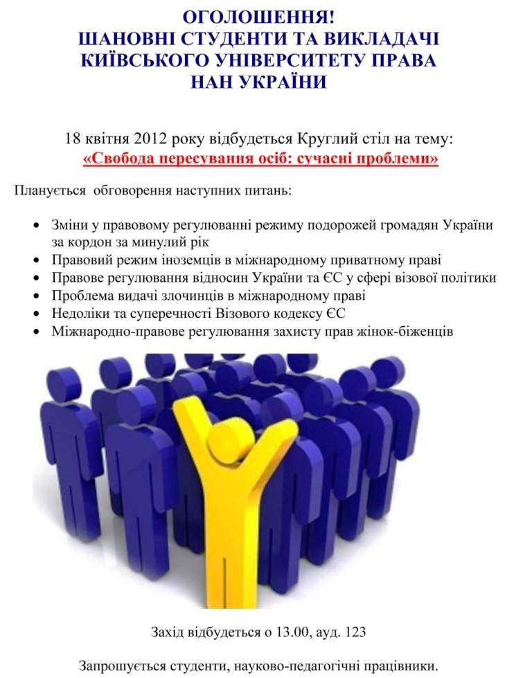 Увага! 18 квітня 2012 року відбудеться Круглий стіл на тему: «Свобода пересування осіб: сучасні проблеми»