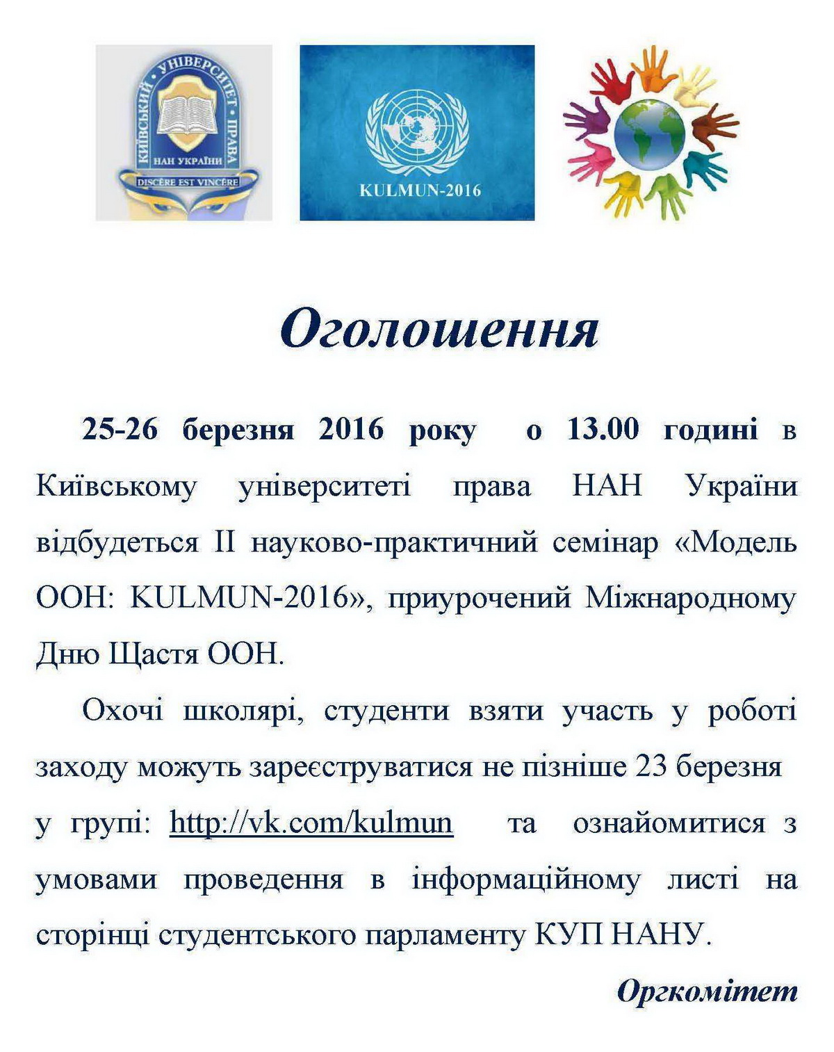 Увага!25-26 березня 2016 року у КУП НАНУ відбудеться ІІ науково-практичний семінар «Модель ООН: KULMUN-2016»