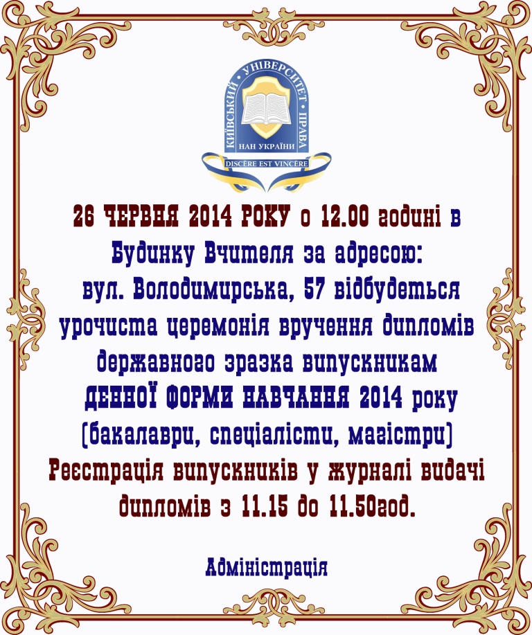 Увага! 26 червня 2014 року відбудеться урочиста церемонія вручення дипломів бакалавра, спеціаліста та магістра денної форми навчання