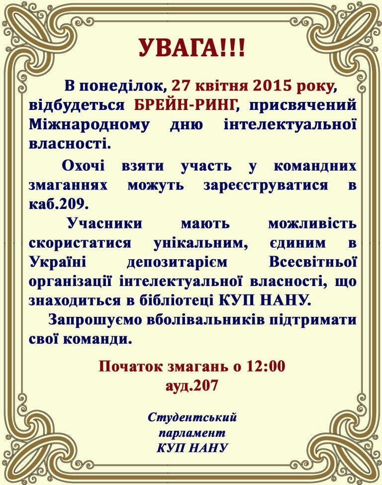 Увага! 27 квітня 2015 року, відбудеться брейн-ринг, присвячений Міжнародному дню інтелектуальної власності