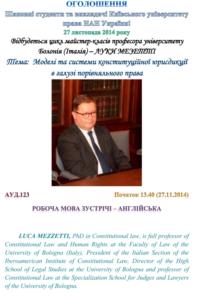 Увага! 27 листопада відбудеться цикл майстер-класів професора університету Болонія (Італія) – Луки Мезетті