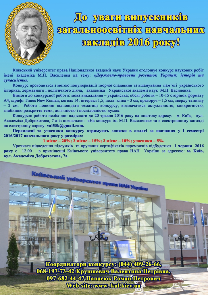 Увага! КУП НАНУ оголошує конкурс наукових робіт ім.М.П.Василенка для учнів 11-х класів