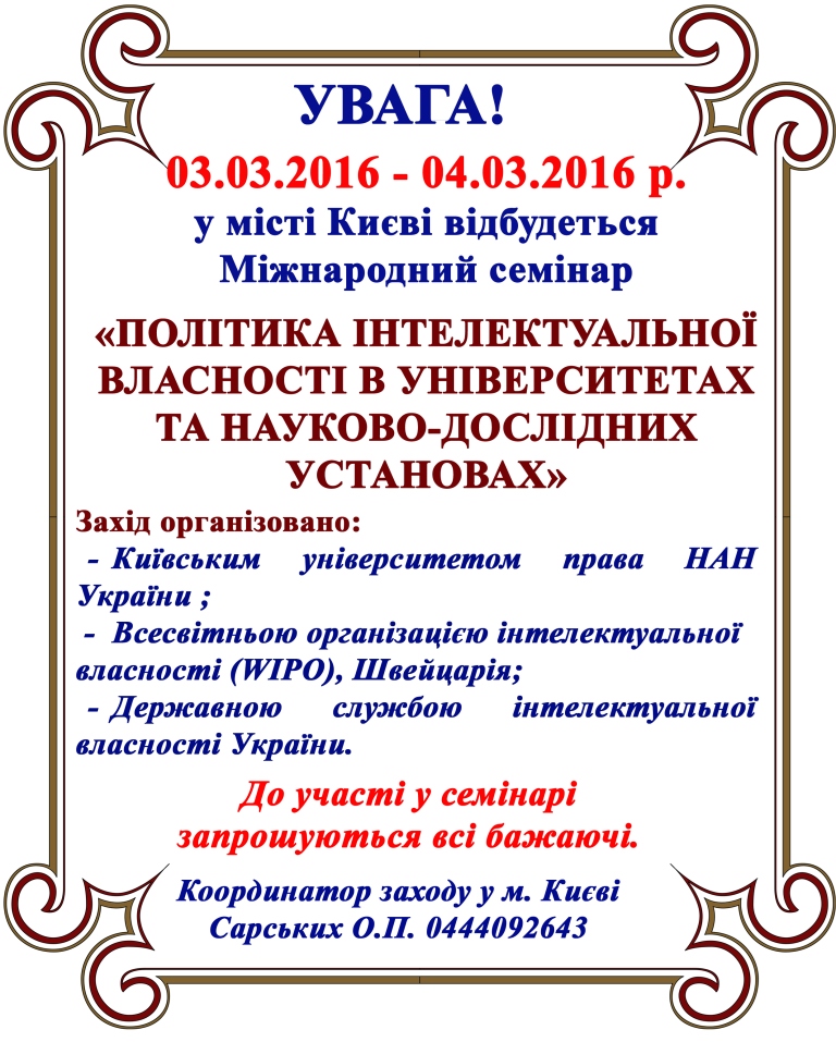 Увага! Міжнародний семінар КУП НАН України з інтелектуальної власності, м. Київ