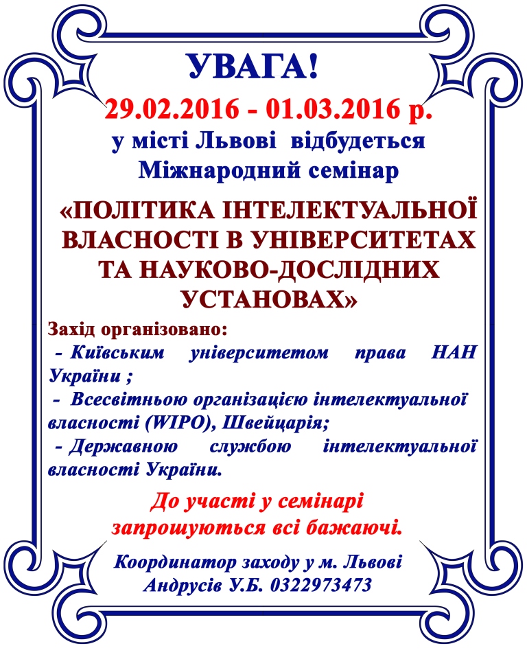 Увага! Міжнародний семінар КУП НАН України з інтелектуальної власності, м. Львів
