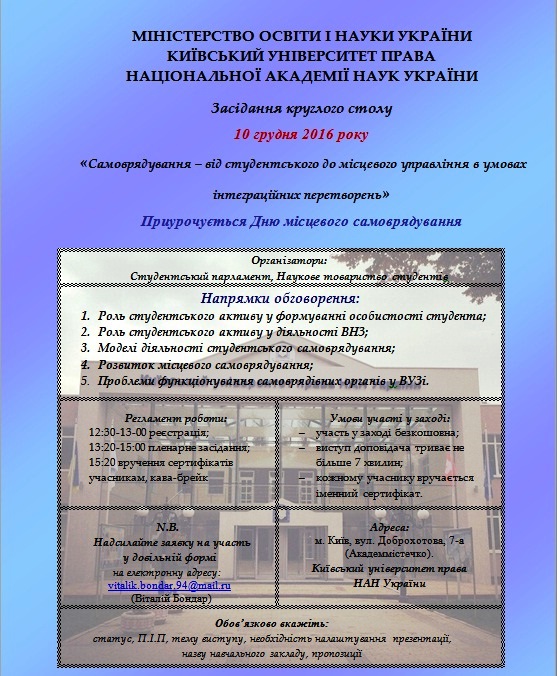 Увага! У КУП НАНУ відбудеться круглий стіл “Самоврядування-від студентського до місцевого управління в умовах інтеграційних перетворень”