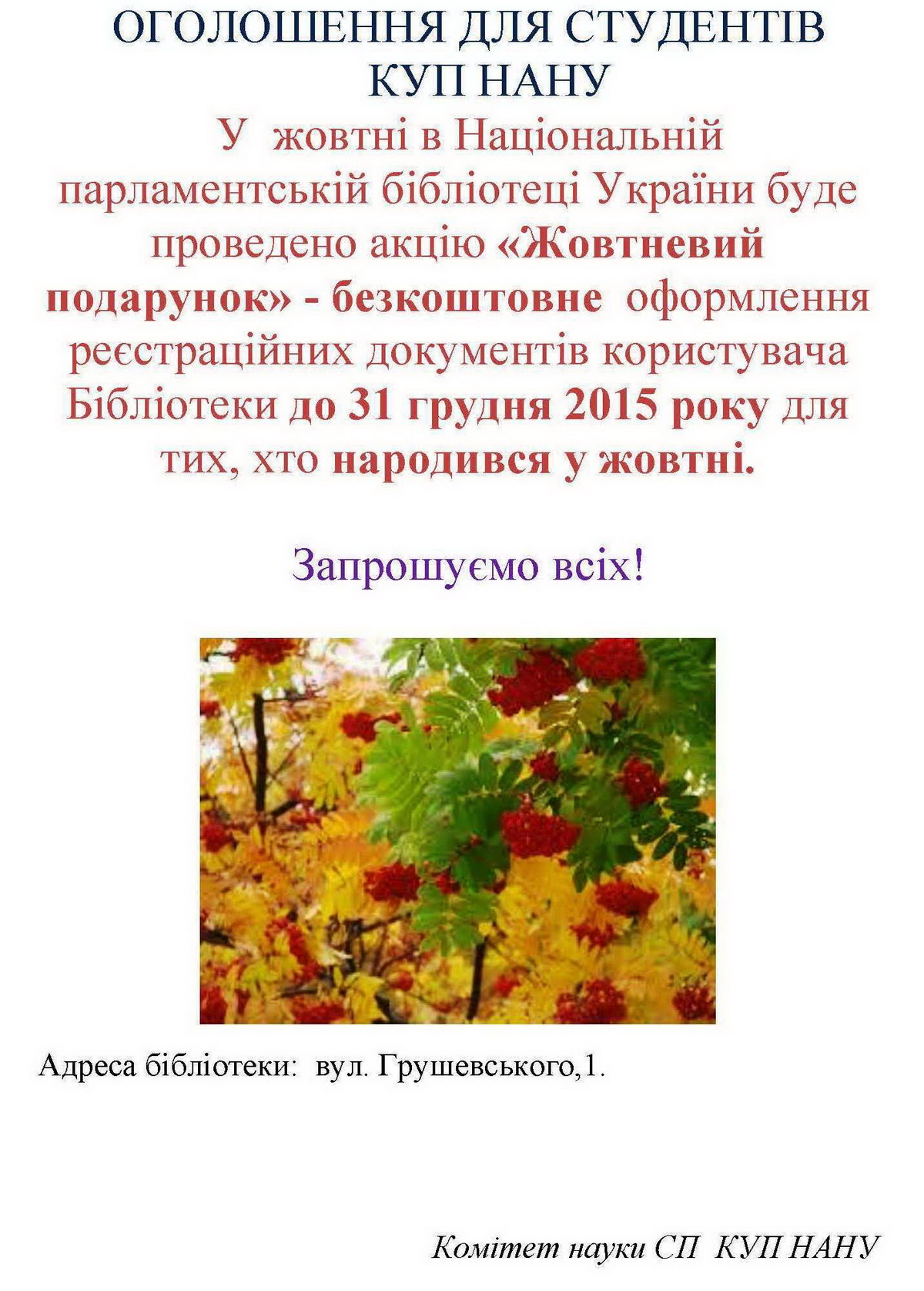 Увага! У Національній парламентській бібліотеці України буде проведено акцію «Жовтневий подарунок»